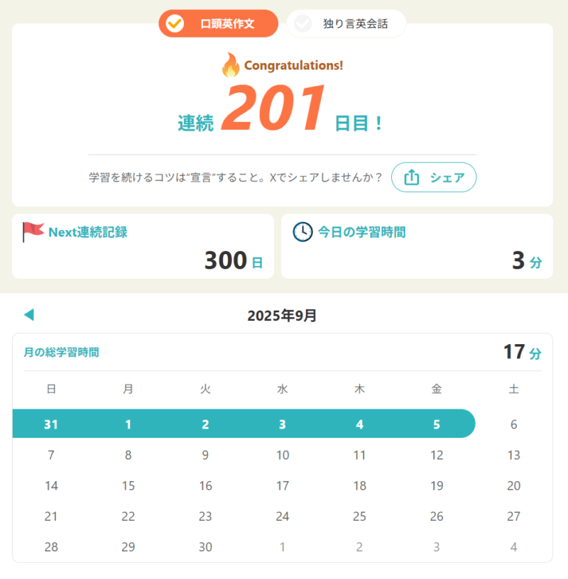 ちなみに、私は記事を書いている2025年5月現在で103日連続学習中! →2025年9月で201日連続学習中です!